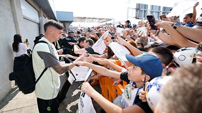 El equipo fue recibido por cientos de aficionados y los jugadores firmaron autógrafos antes de trasladarse al hotel Eurostars Palacio de Cristal, su lugar de concentración en la previa del encuentro contra el Oviedo en el estadio Carlos Tartiere (21:30 h; Orange Tv y Dazn).